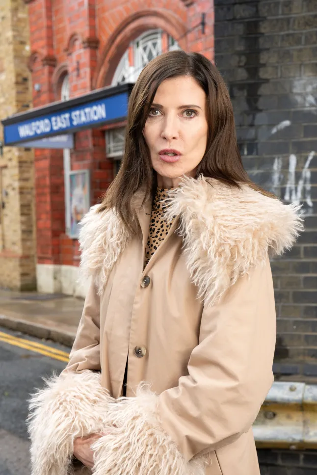 Ronni Ancona as Bea Pollard in EastEnders, looking at the camera outside of Walford East Tube station.